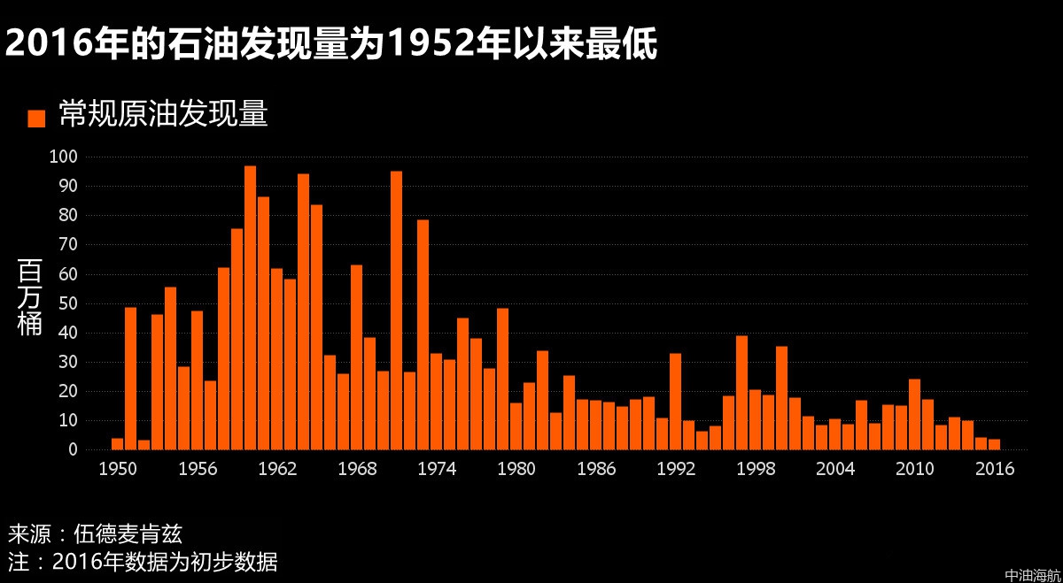 除此之外,2017年对于石油勘探也将是一个转折年。据伍德麦肯兹(Wood Mackenzie)数据,由于勘探商削减开支,去年发现的石油数量是上世纪50年代以来最少的,但从今年起可能就不一样。